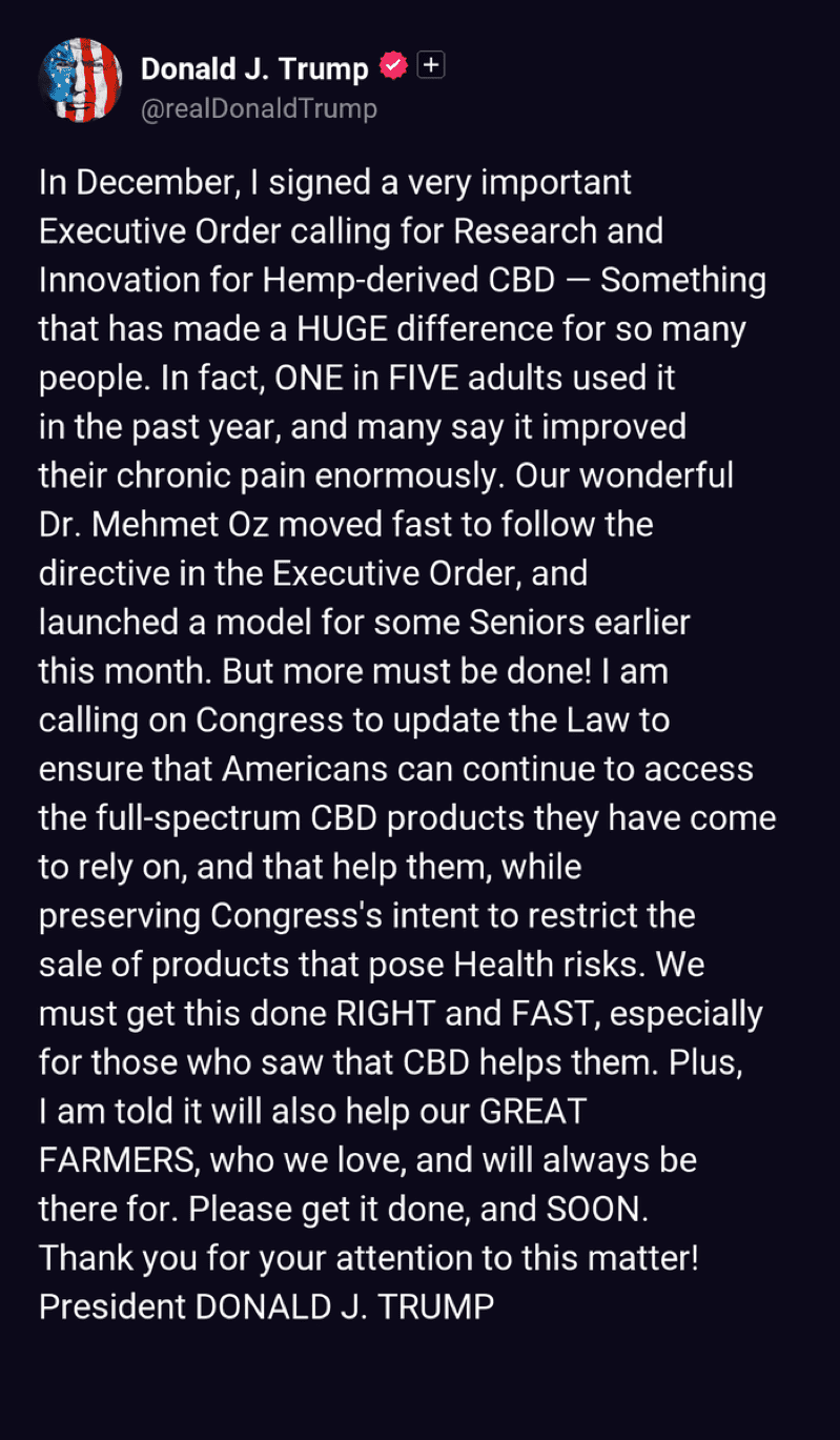 Major Development: President Trump Calls on Congress to Protect Hemp Access